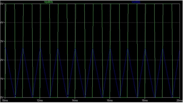 矩形波入力(緑色)に対して、三角波(青色)に積分された波形が出力されています。