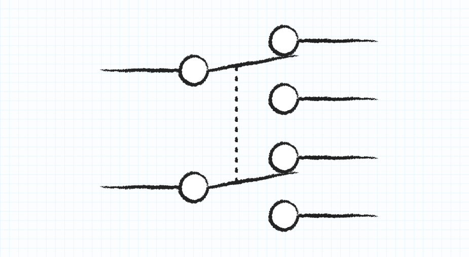 双極、双投(DPDT)スイッチは、リンクされた2つのスイッチを使用して2つの回路を制御します。 1つのスイッチがポジションを切り替えると、もう一方のスイッチも同じ動作をします。 それぞれ、回路内の異なる経路に電流を方向転換させす。技術的には、このような配置で複数のスイッチを接続して、複数のポールと複数のスローが可能です。